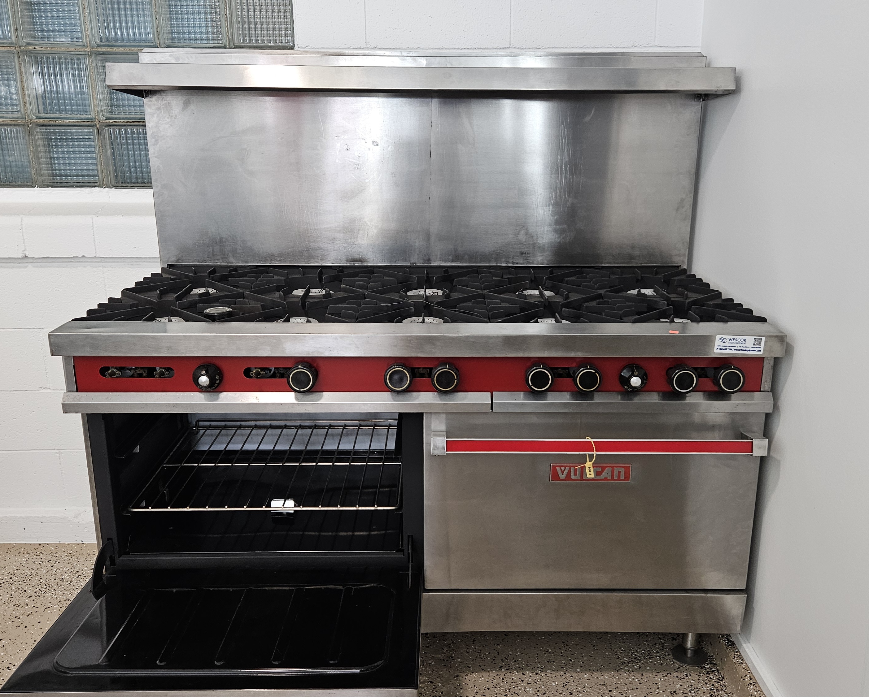 REFURBISHED...60" Natural gas Vulcan 10 burner range with two regular ovens, high back splash with shelf.