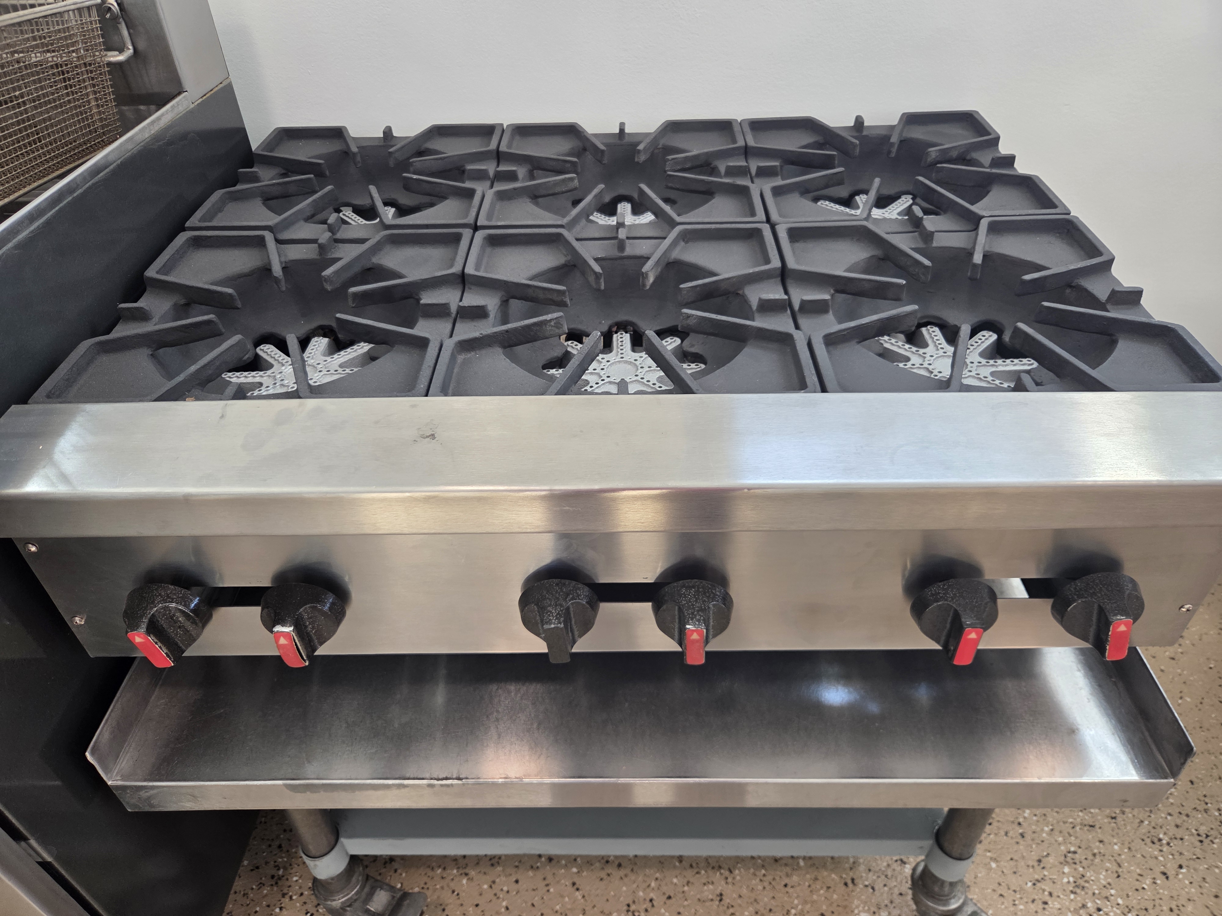 REFURBISHED...4 burner hotplate and a 4 ft griddle both natural gas and sitting inside a stainless steel equipment stand