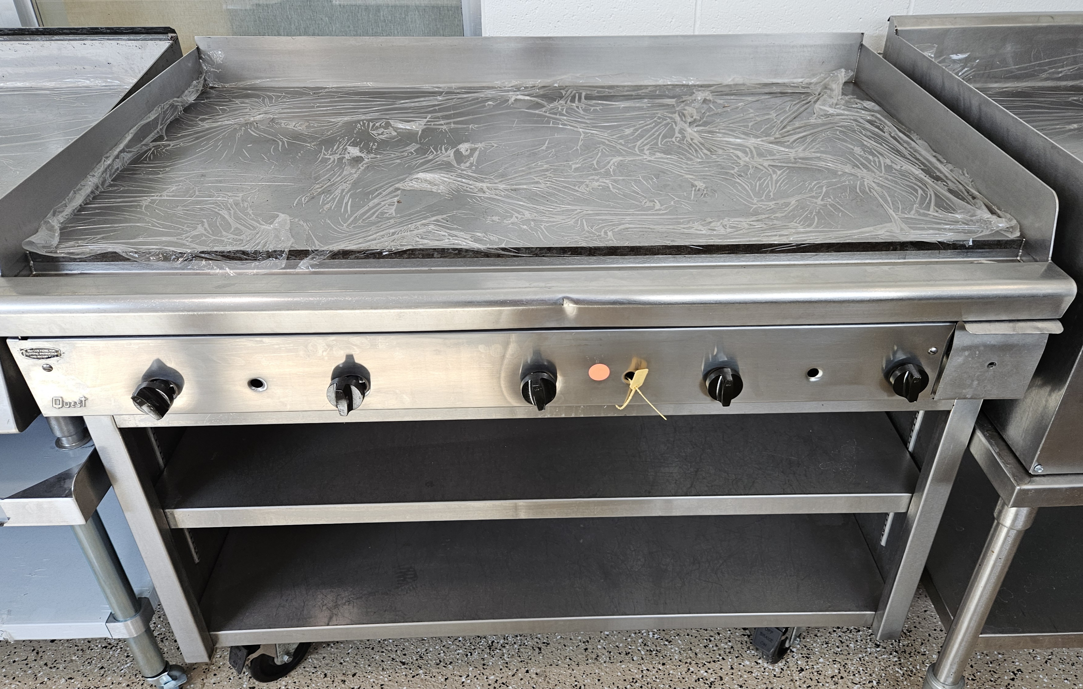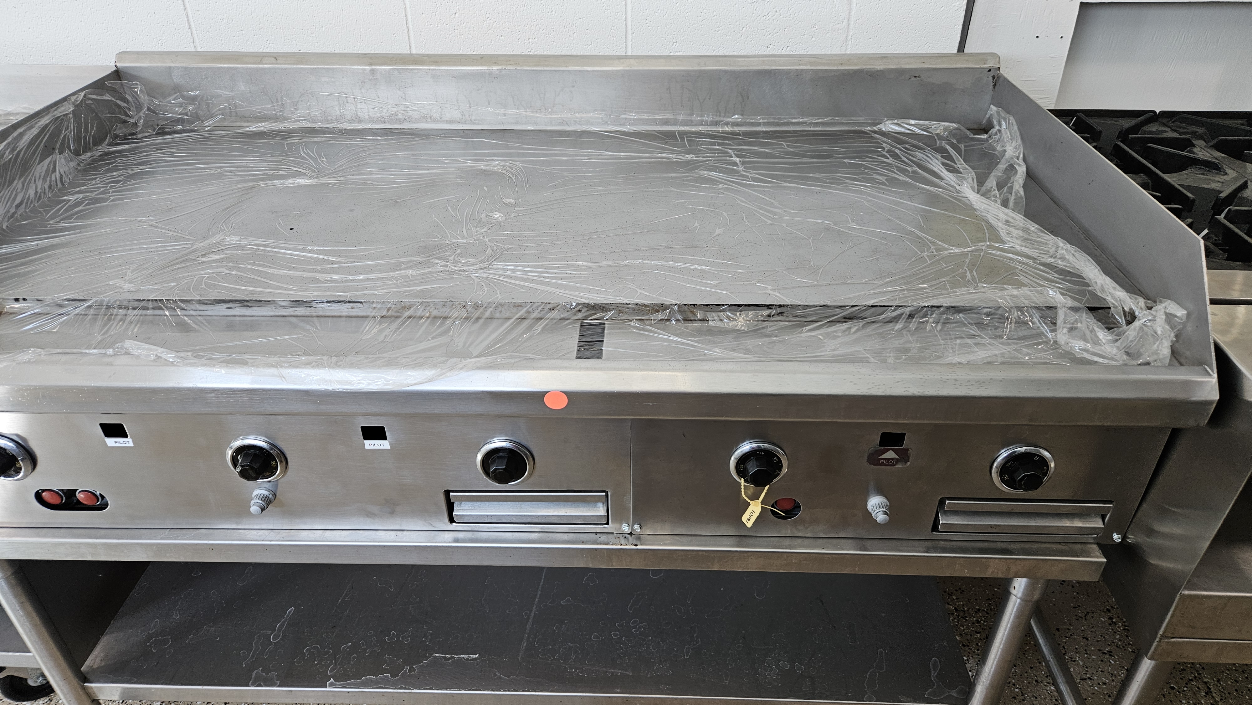 REFURBISHED...5ft thermostatically controlled N/G griddle with push button ignition on stand with shelf and casters