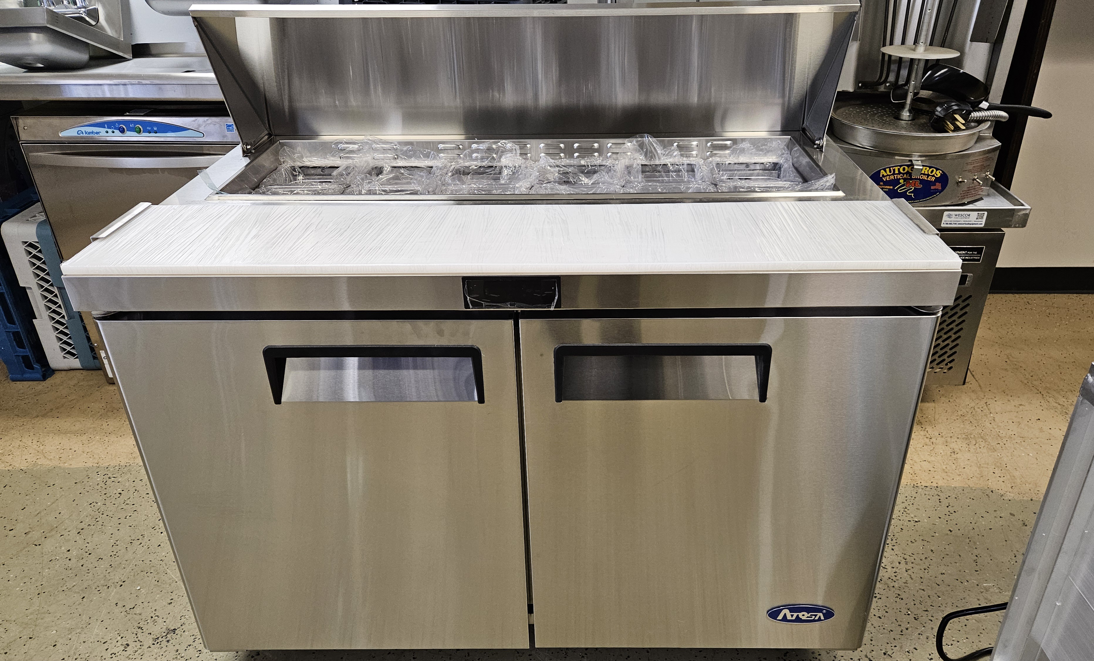 Atosa Sandwich/Salad Top Refrigerator, two-section, 48-1/5"W x 30"D x 41-3/8"H, includes (12) 1/6 poly pans, rear-mounte