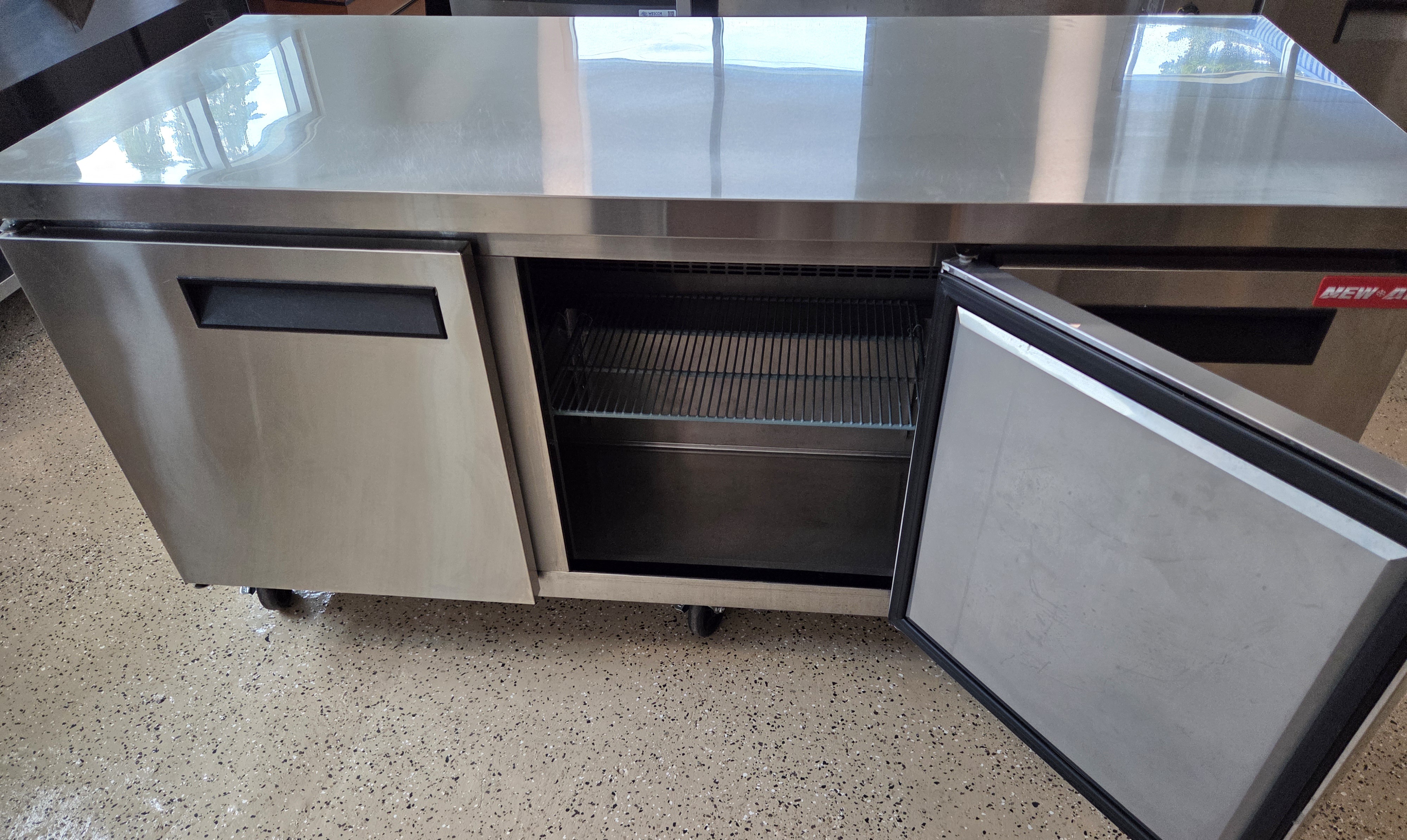 REFURBISHED...5ft, 2 door refrigerated pizza prep table. Come with shelves and lift off lids for inserts. This unit al